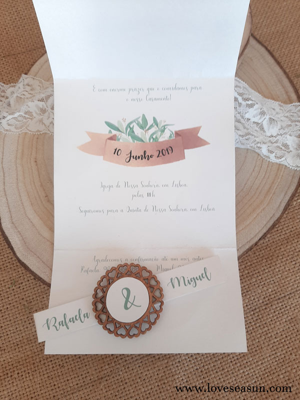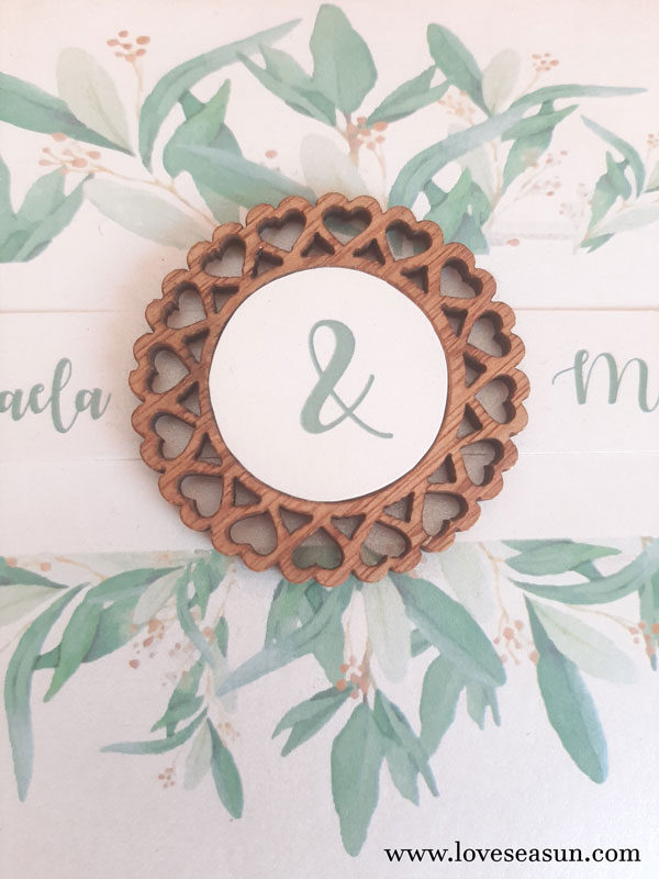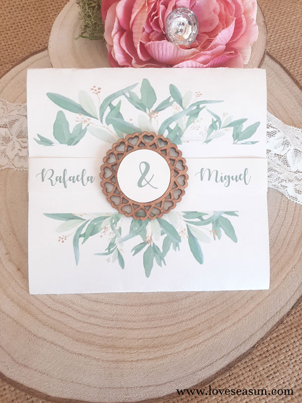 Convite com papel branco metalizado e desenho de folhas.